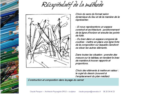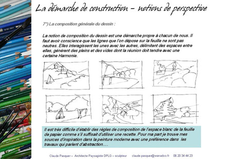 Afin de savoir exprimer une ambiance de jardin, l’apprentissage du dessin se passe en extérieur. Les lieux d’expérimentation se déplacent dans le paysage selon la dynamique de travail du groupe. La progression graduelle des techniques de dessin se déroule au gré des lieux visités.