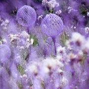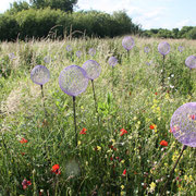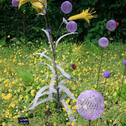 « Sculptillonnage », la création de ce mot, entre sculpture et hortillonnage, esquisse un nouveau vocabulaire de jardin. Par leur répétition, leur nombre et leurs couleurs, ces petites sculptures définissent des espaces dédiés à la biodiversité selon l’esthétique choisie et indiquent au jardinier les emplacements qu’il ne tondra plus pour un temps. Il libère ainsi l’expression de la dynamique végétale.